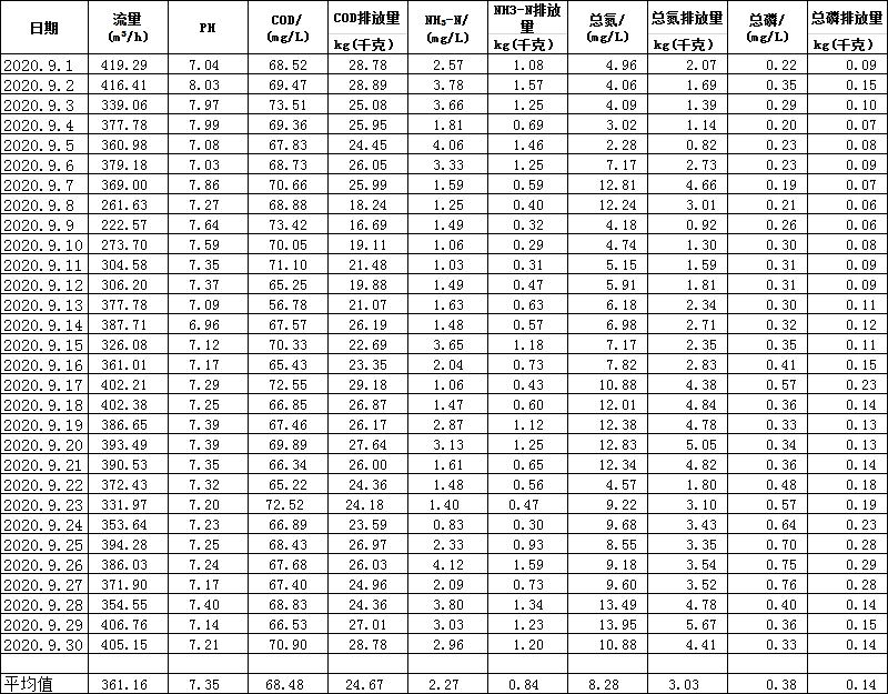水在線監(jiān)測月報表(9月份)