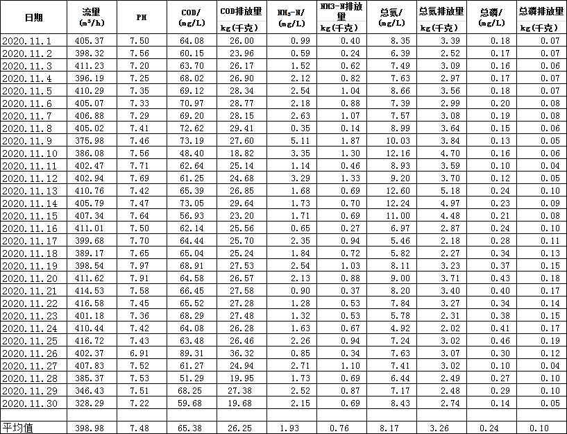 水在線監(jiān)測月報表(11月份)